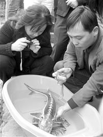 當日下午3時左右,當?shù)孛窆ち_某到江邊洗手,一艘輪船開過后,羅眼前突然一亮:不遠處,有一個黑乎乎的東西被江水沖到沙灘上,不停地擺動。羅走上前去一看,是一條3公斤左右的大魚。該魚形狀怪異,羅從未見過。他抱起該魚,準備到街上賣個好價錢。“怪魚”的出現(xiàn)引來不少人圍觀,一名中年婦女以70元的價格正準備買下,宜賓某公司員工廖誠正巧路過,一看“怪魚”,發(fā)現(xiàn)與他在電視上見過的中華鱘非常相似,急忙打電話向該市漁政管理部門報告。