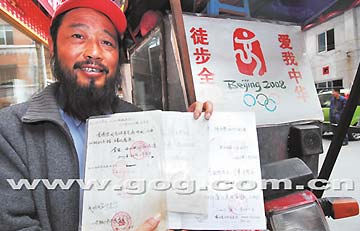 10月21日下午,“徒步中國,宣傳奧運(yùn)”的湖北宜都人李春華在貴陽河濱公園,向記者展示國家奧組委和他所到地區(qū)政府給他的題詞以及加蓋的公章。今年45歲的李春華,2000年12月26日從云南西雙版納開始實施自己多年的夢想,徒步全國,宣傳奧運(yùn)。七年間,李春華歷經(jīng)風(fēng)雨和苦難,足跡遍及大半個中國,預(yù)計23日從貴陽離開前往云南,走完這一行的最后一段。