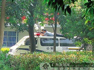 當(dāng)日上午9時(shí)15分,記者在南寧市第八人民醫(yī)院內(nèi)見到,醫(yī)院籃球場(chǎng)南側(cè)一片樹林里,一頭水牛正站在樹間吃草,籃球場(chǎng)邊停靠著兩輛警車,有持槍民警在附近警戒。