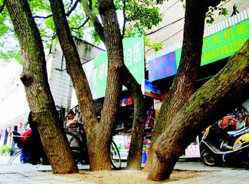 同一條根,6個(gè)主枝,在芙蓉中路三段145號(hào)一家店鋪前有這樣一棵罕見的“6胞胎”樟樹。其中最粗的160厘米,最細(xì)的也有80厘米,通高21米,樹冠面積70—80平方米。