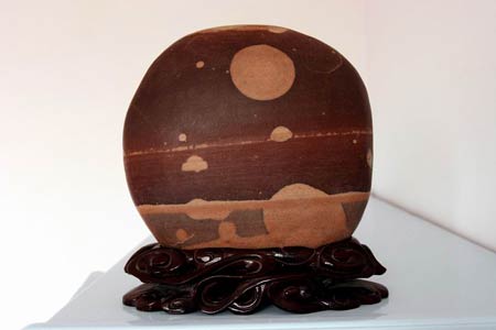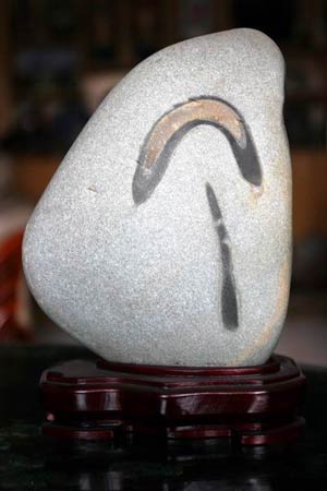 無獨有偶,當日下午1時許,記者在西固區河口鎮的張先生家中也看到了一塊類似的黃河奇石,不同的是該黃河石的體形稍大,呈淡褐色,黃河石正面上部有一個直徑約4厘米的銀色滿月,滿月的左下方有一顆衛星在做繞月飛行,而且繞月軌道清晰可見。張先生告訴記者,大約一年前,他從一位石友處發現了這塊黃河石,當時覺得挺普通,并沒在意。最近電視、報紙連續報道“嫦娥”奔月的相關消息,他突然發現這塊黃河石頗似衛星升空后繞月飛行的場景,便從那位石友處高價購得。(記者 王少丹)