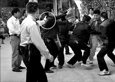 5分鐘后,校方員工再次出動,有的人手上還拿著兩根一米長的鐵棍,而工人們順勢從門口的竹籬笆處拔下七八根碗口粗的毛竹對鐵棍,雙方開始一場混戰,“啪、啪”聲不絕于耳。兩三分鐘后,毛竹被打爛,就在工人高喊著找磚頭時,警方趕到。一名警察一邊高喊“不許打架”,一邊拿著手中的辣椒噴霧器對著打斗雙方噴射……