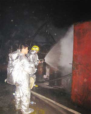 江寧區(qū)消防大隊(duì)東山中隊(duì)的中隊(duì)長(zhǎng)鄭先平告訴記者,到達(dá)現(xiàn)場(chǎng)前,1號(hào)儲(chǔ)罐已經(jīng)發(fā)生爆炸,火焰有幾十米高,爆炸后,產(chǎn)生的流淌火在地面上蔓延,離1 號(hào)儲(chǔ)罐相隔兩米遠(yuǎn)的2號(hào)儲(chǔ)罐周圍擺了兩百多個(gè)塑料桶,桶內(nèi)裝的是廢棄乳化液。流淌火吞噬了塑料桶,接著,一個(gè)個(gè)裝廢棄乳化液的桶就像一串串鞭炮一樣跳躍著炸了起來(lái)。此時(shí),中隊(duì)的三名班長(zhǎng)和一名新隊(duì)員一邊抱水槍給2號(hào)儲(chǔ)罐降溫,一邊向廢棄乳化液桶上噴灑泡沫,但火勢(shì)太猛根本無(wú)法控制。塑料桶爆炸氣浪擊起的廢棄乳化液濺到了他們的面部和眼睛,他們四人頓時(shí)感到眼睛紅腫,皮膚有灼痛感,大家并沒(méi)有后退,而是戴上空氣呼吸器繼續(xù)戰(zhàn)斗。此時(shí),鄭先平見情況不妙,2號(hào)罐已經(jīng)被大火吞噬,漸漸地罐體被燒得通紅,眼看支撐罐體的鋼架也要被高溫熔化了,鋼架的松動(dòng)發(fā)出“咯咯”的響聲,隨時(shí)有倒塌爆炸的危險(xiǎn),鄭先平立即命令所有隊(duì)員后撤。大家接到后撤命令后迅速跑開,剛撤出不遠(yuǎn),身后發(fā)生天崩地裂的巨響,2號(hào)儲(chǔ)罐爆炸了,幾十米高的火焰在夜空中拼命地扭動(dòng)著“身軀”。直到其他消防車和隊(duì)員們相繼趕到,大家繼續(xù)和火魔戰(zhàn)斗。被廢棄乳化液噴濺的三名班長(zhǎng)和一名隊(duì)員傷情逐漸明顯,連夜被送到醫(yī)院救治,目前已無(wú)大礙。據(jù)了解,爆炸的兩個(gè)儲(chǔ)罐內(nèi)裝的都是廢棄乳化液,兩個(gè)儲(chǔ)罐加起來(lái)重量達(dá)30噸。