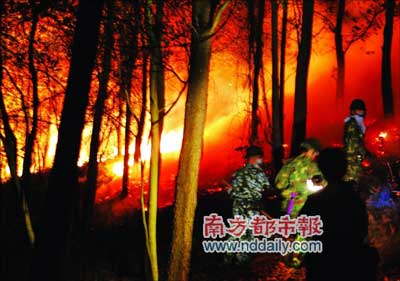 昨日凌晨0時許,廣州白云區太和鎮東坑塘山與京珠高速接駁處山頭陷入火海,火勢一度蔓延至山腳,威脅到村莊和京珠高速。接警后,市森林防火指揮部帶領5支森林防火大隊,在市消防、太和鎮消防的協助下,采用高壓水車與水泵串連的先進技術,實施夜間遠程滅火,40分鐘內控制火勢,確保了山腳眾多村莊的安全和京珠高速的正常通車。白云警方在現場抓獲一名疑患精神類疾病的男子,后證實山火正是因其無意縱火而致,該男子目前已被拘留。