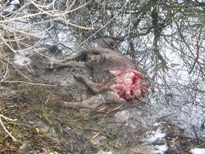 就在這時(shí),動(dòng)保處的同志接到電話:板石鎮(zhèn)孟嶺村五隊(duì)村民趙智國(guó)家的牛被咬死。經(jīng)查,11月9日,趙智國(guó)家一頭3個(gè)月的公牛失蹤,經(jīng)查找在距村屯2公里處的盤嶺溝發(fā)現(xiàn)牛已被咬死,牛的臀部已被吃掉。11月12日,管理局野生資源保護(hù)處工作人員認(rèn)定該牛確被野生東北虎咬死。