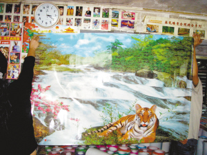 記者隨即趕到這家商店。店里的伙計(jì)從倉(cāng)庫(kù)里面搬出50張已經(jīng)落了灰塵的一卷年畫。展開一看,全部是一模一樣的《老虎臥瀑圖》。上面均印有“鑫龍墻畫”的商標(biāo)和“TQ8301”的編碼。