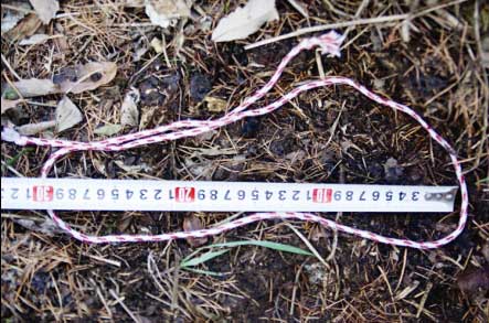 現場人員決定再從河邊著手,查找可疑痕跡。調查人員發現,在腳印左邊的灌木叢上,一根距地面1.2米高的樹枝擋住去路,其上3根小枝似乎被不明物體通過時絆動,因擠壓而折斷。地上有明顯不規則的連續腳印,步距1米多。在腳印繞過一塊大石頭的地方,他們發現落葉腐殖土上的一大一小、同向、前后相鄰的兩個腳印(非鞋印),且能夠分辨出均為左腳。由于時間有限,調查人員決定放棄用帶來的石膏灌制腳印模型,待后續處理。