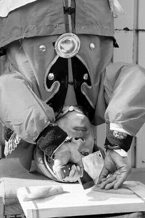 劉永全說,除了這些,他還能倒立打腰鼓。在助手的幫助下,劉永全左右膝蓋各綁上一個腰鼓,腰上一左一右系了兩個,然后又在脖子處固定了一個腰鼓。一切準備工作做好,劉永全“騰”地一下倒立起來,然后兩手上下翻飛,節奏感極強,鼓聲鏗鏘有力,從旁邊經過的路人也被吸引了過來。“樹活皮,人活臉,出門前一定要化個妝。”劉永全說著,拿起放在旁邊的油彩小心地勾勒了起來,一會兒,勾勒出了一張活靈活現的猴臉。