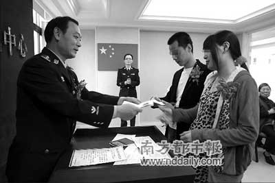 在得知女友懷上了孖仔后,為了給即將出生的兩個(gè)寶寶一個(gè)合法的身份,中山市看守所內(nèi)的服刑人員袁某提出要與女友結(jié)婚。看守所所長證婚,婚禮現(xiàn)場的布置由看守所的民警一手張羅。11月21日,袁某與女友如愿在中山市婚姻登記中心登記成為合法夫妻,成為中山市首個(gè)登記結(jié)婚的服刑人員。