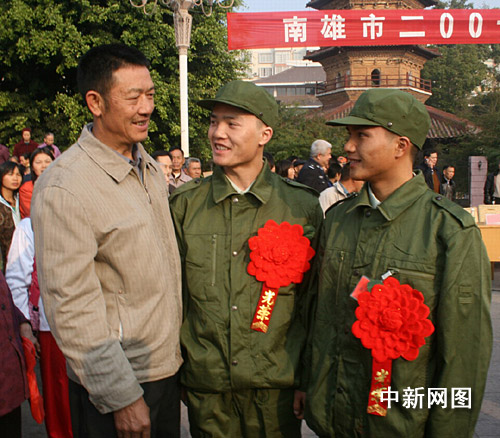中新網韶關12月4日電(馮昶 李凌 朱祖純 李子亮)12月4日,粵北革命老區南雄市三影塔廣場人群涌動,紅花簇簇,一派喜氣洋洋的熱鬧場面,當地政府在這里舉行隆重的進藏新兵交接儀式。家住南雄市鄧坊鎮洋西村的一對畬族同胞兄弟藍旭東、藍善斌雙雙踏上了進藏當兵的旅程。