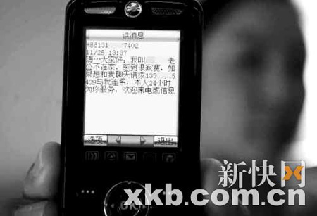 據稱,這個神秘的陌生人曾一度發短信息要求和郭小姐約會。見郭小姐不予理睬,對方又發些編造的短信給郭小姐的丈夫。“居然說我背著丈夫做對不起他的事,這純粹是誹謗!”郭小姐氣得咬牙切齒。