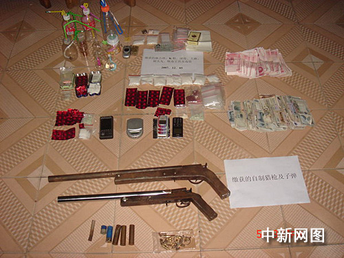 中新網(wǎng)韶關(guān)12月7日電(馮昶 陳文明 張黛虹)廣東韶關(guān)樂昌市警方今天稱,警方在日前開展的代號(hào)為“搜狐”的緝毒行動(dòng)中,成功抓獲了販毒犯罪嫌疑人6名,當(dāng)場繳獲自制獵槍2支,子彈4發(fā),搖頭丸、冰毒等一大批毒品,以及毒資人民幣5000多元。至此,一個(gè)在樂昌市區(qū)娛樂場所販賣毒品的特大涉槍販毒團(tuán)伙被警方成功摧毀。