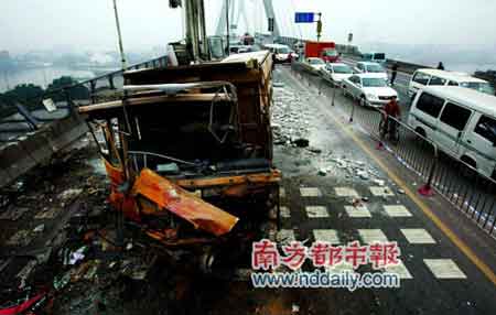 當(dāng)時(shí),開車經(jīng)過現(xiàn)場(chǎng)的陳先生目擊了事故全過程。他說,泥頭車速度很快,壓著靠近護(hù)欄的內(nèi)側(cè)車道由北往南行駛,行至上橋近100米處時(shí),突然“挨上”護(hù)欄,將護(hù)欄一路推前了大概十五米。“奇怪!它前面沒多少車,身邊也沒人超他車”,陳先生說。泥頭車撞上迎面駛來的一輛中巴后,又頂住中巴,將其推到大橋邊上。“幸好橋邊有鐵絲網(wǎng),不然肯定掉下去了”。