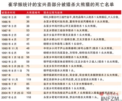 原寶興縣林業局局長、原四川寶興蜂桶寨國家級自然保護區管理局局長、大熊貓專家崔學振不完全統計,二十年間寶興縣就有20只大熊貓被獵殺。(見附表)