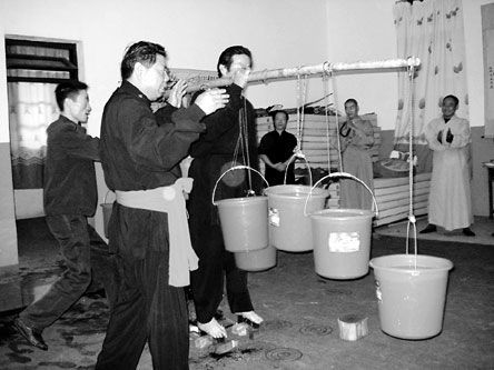 陳師傅說,除了踏刀提水外,他還有金剛腿、金槍刺喉等絕活!斑@些功夫源自少林。運功后,身體的肌肉會變硬,可抵擋銳器!彼f,最先練踏刀提水時,是嘗試性地站在刀刃上,當時腳也會被割傷。隨著時間推移,腳皮越練越厚,在刀刃上堅持的時間也越來越長。