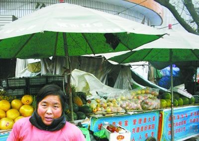 這里的商販全都沒撐傘,除兩個水果攤外,其他服裝攤也沒使用統一車輛。記者問一水果攤商販:“你們怎么沒買市容局的傘?”“買了兩把,天冷了,用不上就放家里了。”一商販說。