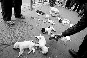 昨日上午10時50分許,在豐臺太平橋城管分隊執法過程中,六里橋南一處地攤十余只待售貓狗等小動物遭故意摔踩斃命。城管隊員稱是攤主對抗執法故意殺死動物,附近無照攤販們稱虐殺小動物是城管所為。事發后,一度有近300名群眾圍觀表達不滿,中國小動物保護協會會長蘆荻前往豐臺城管大隊了解事實真相。