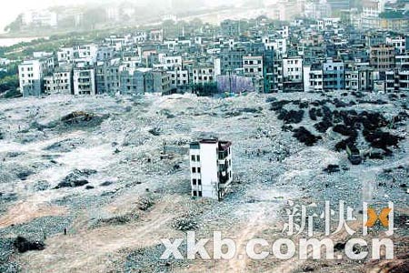 曾經密密麻麻蓋滿了“握手樓”的獵德村,迅速成為一片空曠的大工地,村屋幾被拆完。然而,殘垣斷壁中,一棟樓房依然聳立,從高處看去很是顯眼。