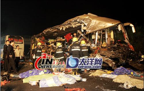 今天凌晨1點40分左右,渝湛高速洋青路段發生特大交通事故,一輛深圳開往南寧(桂A18716)的臥鋪客車追尾撞上一輛新奧燃氣低溫液體運輸半掛車后,沖過中間防護欄狂奔三十多米,迎面和另一輛貴陽開往珠海(粵C50821)的臥鋪客車相撞,當場造成十人死亡七人重傷。目前事故原因正在進一步調查中。