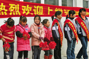 下午2時50分,捐贈單位代表在學(xué)生“熱烈歡迎”聲中來到學(xué)校。幾位代表發(fā)言后,他們逐個班級向?qū)W生們贈送書包、詞典、筆記本等文具。其中一名代表告訴記者:“本來說好2點鐘來的,后來開會耽誤了。”