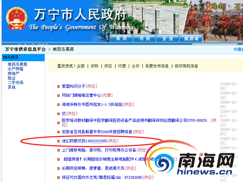 記者打開萬寧市人民政府網(wǎng)站時,在首頁上點擊進入萬寧信息供應(yīng)平臺,在該平臺上的“南藥瓜果”欄目的第六條信息中,記者發(fā)現(xiàn)“迷幻藥蒙汗藥13082***905[供應(yīng)]”的信息。點擊進入時,里面的內(nèi)容非常詳細。不但介紹了香港GHB粉、香煙型迷藥、噴霧型迷藥等各類迷幻藥蒙汗藥的成分、價錢、服用方法,還標(biāo)明了服用后的反應(yīng)。該信息還稱,“誠信交易,貨真價實,無效退款。。澜磺性p騙分子復(fù)制本公司廣告。!本公司本著信譽第一,效果保證,誠信經(jīng)營的原則,真誠與全國各地朋友長期合作,真正需要貨的朋友,請注意,提防騙子用低廉價格寄假貨,來騙取你們急需等著用貨的人,請不要貪小便宜而上當(dāng),效果那么好,能賣你兩三百元,四五百元嗎?我們的藥雖然比別人貴了點,但效果絕對保證達到我們廣告所說那種效果,貨到你們當(dāng)?shù)啬阍囈幌拢憔椭牢覀兊乃幮Ш托抛u。本公司奉勸那些網(wǎng)絡(luò)騙子。不要再騙那些真的需要藥的朋友了,都是在外面混的人。少做點讓人罵的事。也勸沒有貨的商家,我這里有大量的貨可以批發(fā)給你們,你找不到進貨渠道?梢栽谖疫@里拿,你要的量大。我們可以談。批發(fā)的價錢可以給你去賣,并且比你騙別人的那點錢,賺得多,誠信經(jīng)營生意越做越大,欺詐客戶生意越做越小。歡迎來電洽談合作!