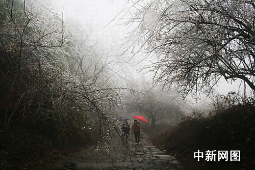 在遠近聞名的梅關古道兩側,目光所及都是一片銀枝玉葉、冰掛霧凇,樹上早已綻放的千姿百態、婀娜多姿的白梅、臘梅、綠梅與晶瑩的冰雪花交輝相映,讓人眼花繚亂。在“嶺南第一關”門樓前,一群群年輕人絲毫不懼嚴寒,或相爭取景拍照留影,或盡情玩耍放聲大喊。“真是意外的驚喜,沒想到這次到南雄來休閑正好遇上了這場雪。古道踏雪賞梅還是第一次”一群從廣州來的游客興奮不已地告訴記者。