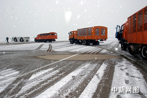 記者在現場看到,2位工作人員正站在除冰車上,拿著類似高壓水槍的工具正對飛機噴解凍液。據現場工作人員介紹,飛機上的冰雪除完以后,就等空管中心通知起飛了。