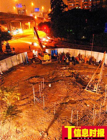 附近工人告訴記者,事故發生在下午6時左右,之前已經灌漿填補的位置突然再次下陷,深度約30厘米,而且中間位置還出現手掌寬的一道裂紋,好在當時工地內并沒有出現意外,施工部門立即著手搶險施工。