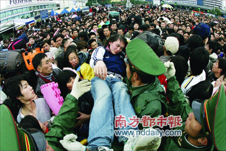廣州火車站廣場,一位暈倒的旅客被接力式從等待進站的人群中送出,武警隨后將她抬至正對著火車站進站大廳的臨時醫療中心。張駿攝