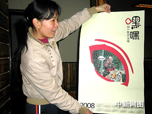 記者看到,網友“小二黑”的“周老虎年畫”作品非常簡潔、有趣,頗具幽默和滿諷刺。年畫左上角寫著“黑嘿,拍一張2萬元”,中間是身材瘦小、眉開眼笑的周正龍騎在一只老虎背上,揮手致意,下面是2008年的日歷。