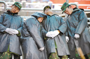 2月14日出版的廣州日報,在頭版頭條位置用半個版的大幅照片刊登了一則尋人啟事,尋找照片中4名累得“站著都能睡著”的子弟兵。這是個令人震撼的瞬間:時間定格在廣州春運最緊張的2月4日,畫面中,4名年輕的戰(zhàn)士身穿雨衣,斜倚在火車站廣場的護欄上,靜靜地睡著了。當時,廣州最低氣溫只有4℃,天剛下過小雨,只有極度的疲憊,才能這樣站著睡著。戰(zhàn)士睡著了,卻感動著千千萬萬的廣州市民。如今,部隊已經(jīng)回撤,照片上的這4名可愛的戰(zhàn)士是誰呢?他們屬于哪個部隊?他們是不是至今仍奮戰(zhàn)在抗災救災的第一線?