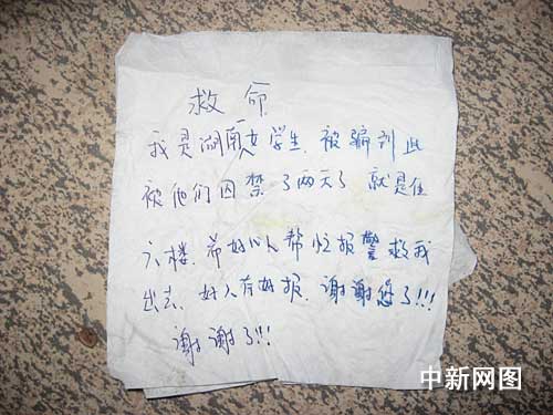 這天下午,一位熱心的中年婦女把發現字條的情況告訴了正在此地巡邏的民警,并把民警帶到樓下。民警見字條上面寫著“救命,我是湖南一女學生,被騙到此被他們囚禁了兩天了,就在六樓,希望好心人幫忙報警救我出去,好人有好報、謝謝您了!!!”。