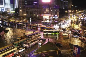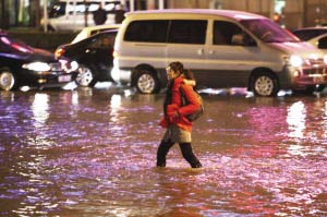 昨天晚上7時左右,(青島)香港中路與南京路路口一處600毫米左右的自來水管道破裂,大水噴起半米多高,西到徐州路,東到國際新聞中心,北到蘇寧電器南京路店,南到東海路的500米范圍內一片汪洋。300多輛汽車通行受阻,100多名住在附近的居民困在車站焦急等候。自來水公司在1小時30分鐘后將水閥關閉。
