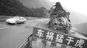 周先生所看到的長安車是一次車禍事故的殘骸。記者在現場看到,殘骸車被擺放在一個大約2米高的水泥展臺上,3個輪胎缺失,因為受到重創,已經成了一團廢鐵,幾根鋼絲將其牢牢捆在展臺上!三關寺中橋位于319國道彭水境內,橋下是四五十米的懸崖。從黔江方向過來有一個90度左右的彎道,彎內是石壁,兩邊不能互見,非常危險。殘骸展臺就在彎外路邊,展臺上寫著“車禍猛于虎”幾個大字,被司機稱為“救命展臺”。