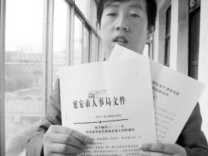 楊延東拿著延安市人事局的文件喊冤。