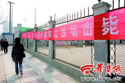 昨日上午10時30分許,記者來到丈八路與朱雀大街路口,遠遠就看到路口的西南角,陜西扶貧技術(shù)學院南校區(qū)圍墻外,掛著紅底白字的醒目橫幅。上面的內(nèi)容是“嚴打‘兩搶一盜’搶劫拒捕者依法當場擊斃”。落款是“長延堡派出所”。
