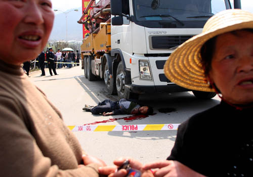 上午12時30分許,記者趕到現場,看到一輛黃色的混凝土輸送泵車被人群包圍著,一位身穿黃色制服的交通征稽執法人員,坐在駕駛室里趴在方向盤上一動不動。記者擠進人群看到,一位中年民工躺在車的右前輪子前面的血泊中,人已經死亡。周圍的群眾、游客情緒激動,指著車上的執法人員罵聲一片。