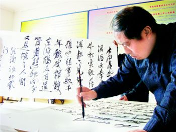 昨天,記者在延慶縣延慶鎮米家堡村見到了49歲的張海河。操著濃重延慶口音的他告訴記者:“我只有初中文化,識字不多,先是種地,后又做建筑安裝,沒想到老了老了,還能練書法,讓鄉親們覺得我是個文化人!”
