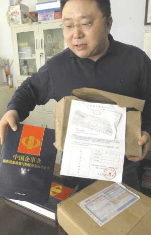 昨日上午,在豐樂五金機電城東南一消防器材店,商戶胡先生拿出兩本天價書,滿臉愁苦。這兩本書的書名為《中國企事業稅收優惠政策與納稅籌劃指導全書》。