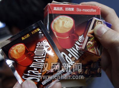 火鳳凰成人保健用品公司的貨架上還擺了一種催情咖啡,沒(méi)有廠名、廠址,方形外包裝與雀巢咖啡十分近似,每盒有8小袋。說(shuō)明稱每袋催情咖啡對(duì)入150毫升開(kāi)水沖泡,30分鐘見(jiàn)效。店員稱其口感與速溶咖啡類似,批發(fā)價(jià)每盒18元。