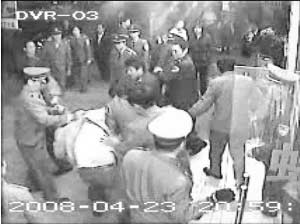 據錄像資料顯示,當晚8點58分20秒左右,在收銀臺前,被城管人員圍攻的王騏嘗試自衛,還手打了其中一名城管人員。其余幾名城管人員見狀,一起撲上來,有的按住他的脖子,有的扯住他的衣服,有的揮拳打上去。但寡不敵眾,僅幾秒鐘,五六名城管人員將王騏控制住,將其拖出小店。