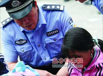 昨天下午5時30分左右,記者在一百貨店門口見到了兩個小女孩坐在地上,看到那么多警察圍過來,都被嚇得哭了起來。