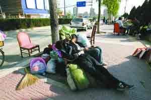 昨日下午3時30分許,修建中的地鐵十號線太陽宮站東北側,冰箱、啤酒箱、柜子、煤氣罐、桌子及一百多張椅子堆放在人行道上,幾名青年男女正倚靠著堆在樹邊的被褥打盹。他們工作的飯店原本有約3000平方米,如今卻成為一片廢墟。
