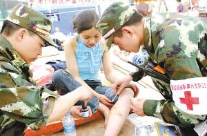 15日16時,廣東邊防六支隊醫療小分隊得知有4名被困學生急需救助后迅速趕往救援地點。有4名學生正通過亂石中的一條縫隙向外呼救,此時距離他們被困已超過75小時。被困4名學生被一一救出。廣東邊防六支隊官兵立即將他們抬上擔架送往戰地醫院救治。15日晚上,在地震發生80小時內,廣東邊防六支隊醫療小分隊在漢旺鎮東汽中學的廢墟中成功救出4名被困中學生。