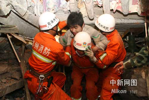 下午五時(shí)許,兩個(gè)戰(zhàn)士冒險(xiǎn)鉆進(jìn)廢墟,在里面升起支撐器,為幸存者提供更大的空間,同時(shí)努力將他從水泥板下拖出。但傷者的腿部被斷裂的水泥板完全壓在了下面,所以無(wú)法將其從廢墟內(nèi)救出。