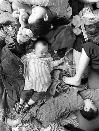 劉碧樹的妻子環顧四周,看到很多孩子和父母都在露天打地鋪,眼圈一下紅了:“小孩子不能洗澡,又天天吃這些方便食品,怎么行啊?”