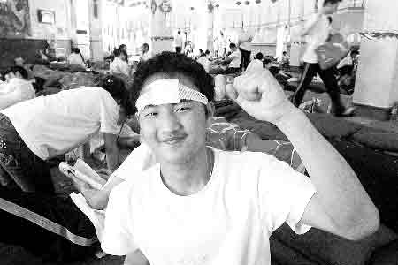 相識的同學們在一起會驅散巨災后的恐懼,血肉相連的兄弟在一起更具有生活的勇氣。在虹苑歌劇院里,記者還看到了一幕溫情的場面:弟弟在哥哥潔白的T恤上題詞:依然范特西,你親愛的老弟!