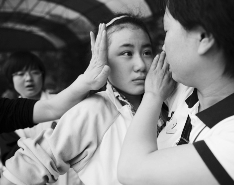 短短十幾秒里,地震越來越厲害。街上的房子開始倒塌,教室屋頂?shù)耐咂谥苋晏m頭上嘩嘩作響。她又沖進教室,看見三個學(xué)生居然還在睡覺。急紅眼的她奮力搖醒睡覺的學(xué)生,又抓了兩個學(xué)生朝外跑。