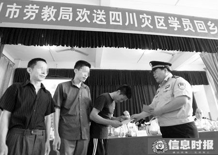 “我出去以后決心痛改前非,好好做人,要把廣州人民的關(guān)愛帶回家鄉(xiāng),積極投身救災(zāi)和災(zāi)后重建工作……”昨日上午9點(diǎn)半,廣州市潭崗勞教所一處禮堂內(nèi)正舉行一個(gè)特殊的儀式,29名四川省籍的勞教學(xué)員被提前解教,他們將乘坐當(dāng)天下午的火車返回家鄉(xiāng),每人還領(lǐng)到了500元慰問金。