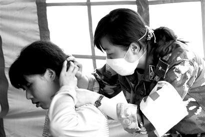 5月12日的晚上,尹萍幫同事們搭好帳篷后,發現自己沒有帳篷了,她只能回到了三樓膽顫心驚地睡覺。半夜,余震將她晃醒,她撥通了愛人的電話,只說了一句話:“老公,我害怕……”就再也忍不住淚水決堤。由于愛人在蘭州,自己的家在銀川,他們一年最多只有一個月的時間在一起。說到這里,尹萍的眼眶又濕潤了,她背起了消毒水,擠出了一個微笑:“我去給戰士們消毒了!(李澤江 記者江瑋實習生楊冬攝影報道)